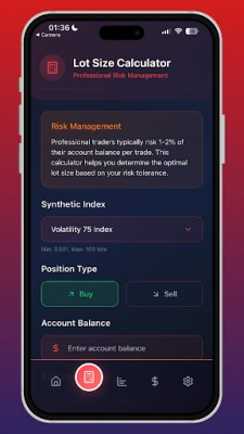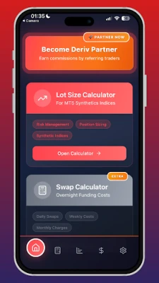 This is a synthetic indices Calculator App Powered by Deriv. This calculator is specifically designed to work on Synthetic indices offered on Deriv MT5 Accounts. We have a lot size calculator and a swap calculator for synthetic indices.